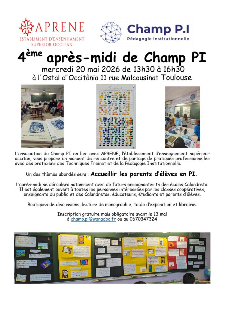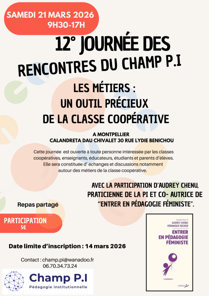 L’association du Champ P.I. Pédagogie Institutionnelle vous invite à participer à sa 10ème Journée de Rencontres dans les locaux d’APRENE à Béziers, Maison de la Vie Associative, 2 rue Jeanne Jugan, le samedi 27 janvier 2024 de 9h à 17h.